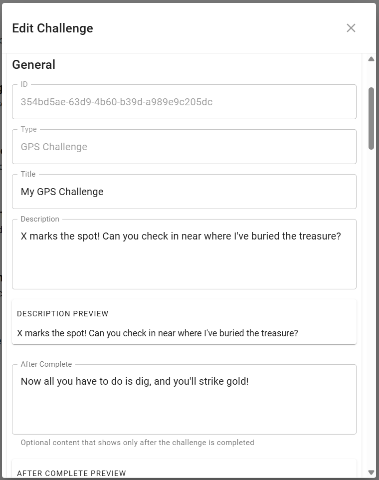 - (Optional) Success Message: By default, the message a player will see in a popup upon completing the challenge is set to "Congrats! You've made it to the location!" Feel free to change this message if you would like.