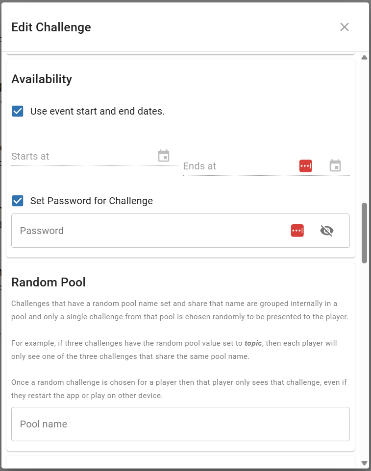 - (Optional) Set Password for Challenge: By default, the box will NOT be checked. If you would like for players to only be able to access this Challenge by entering in a password, check this box.