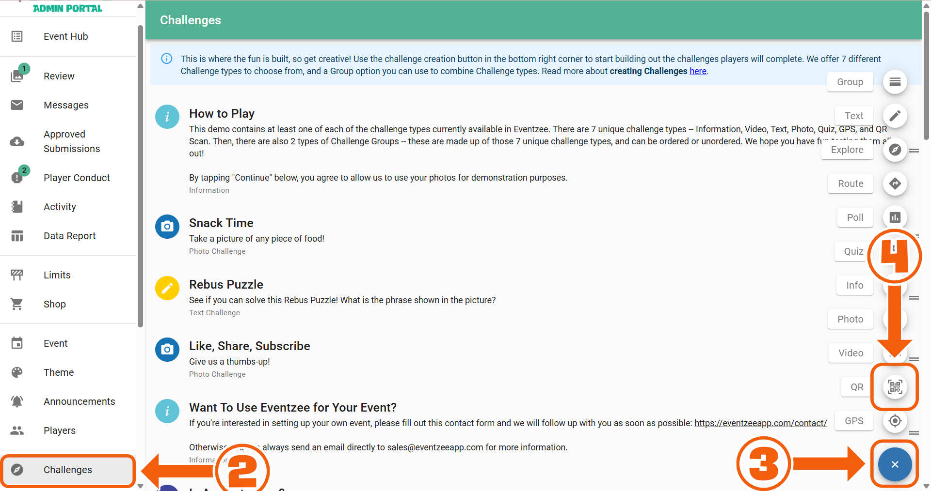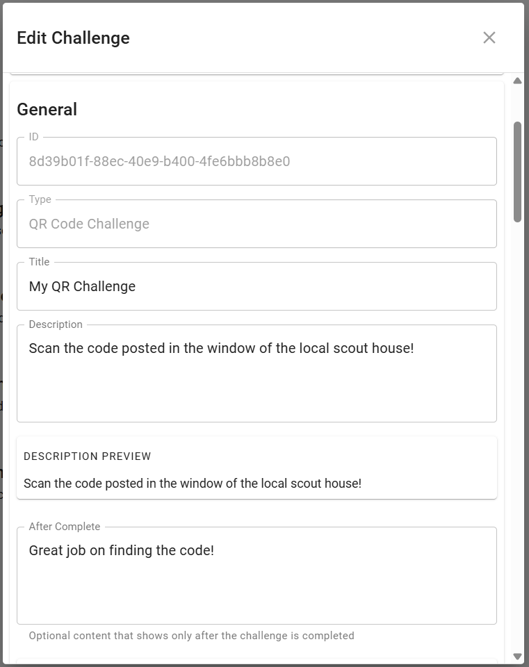 - Description: Enter a text description explaining where players can find the QR code for the challenge.