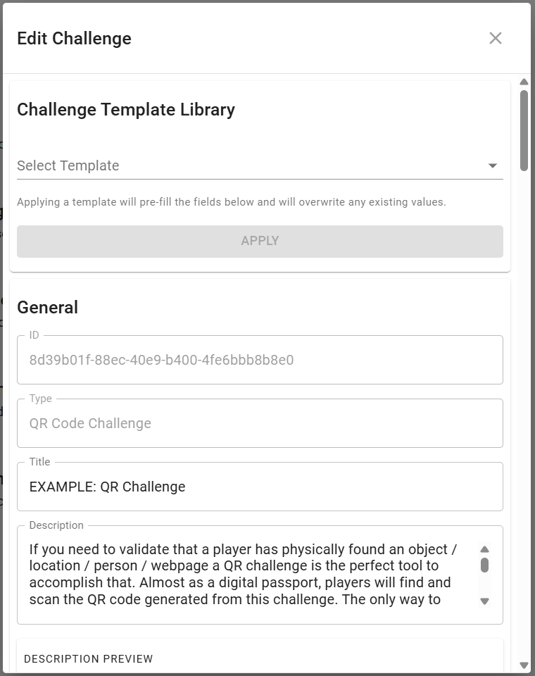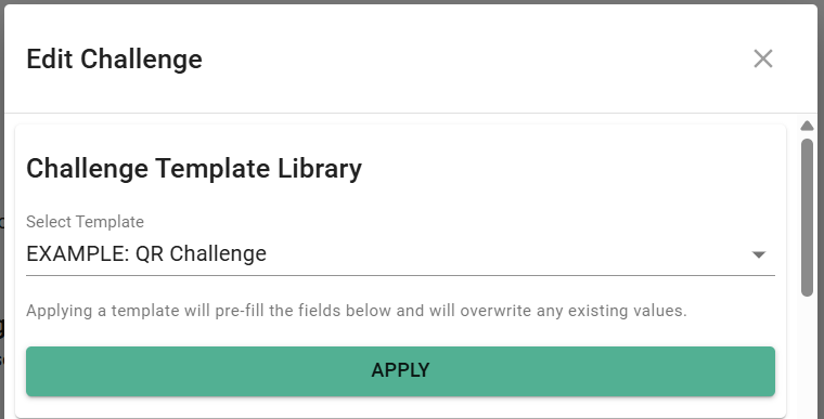 If you've created QR Challenges in the past and made them available as templates, they will appear in the dropdown list so you can easily duplicate them. Simply select one and click [Apply]. Then the form will reload with the fields filled out according to the template.