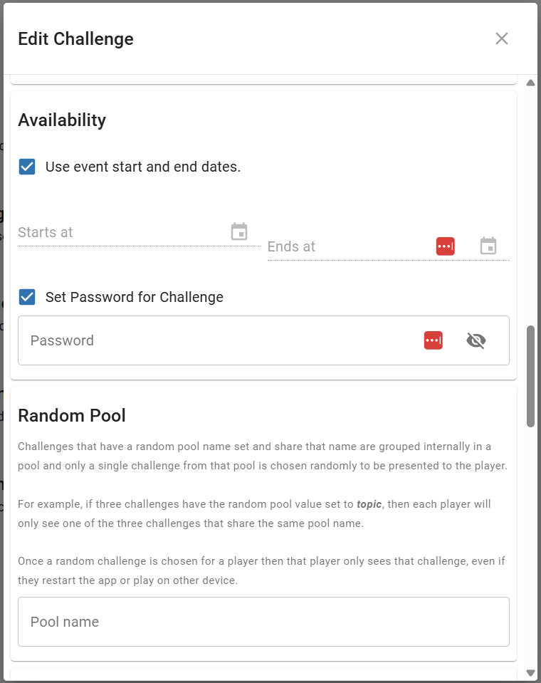 - (Optional) Set Password for Challenge: By default, the box will NOT be checked. If you would like for players to only be able to access this Challenge by entering in a password, check this box.