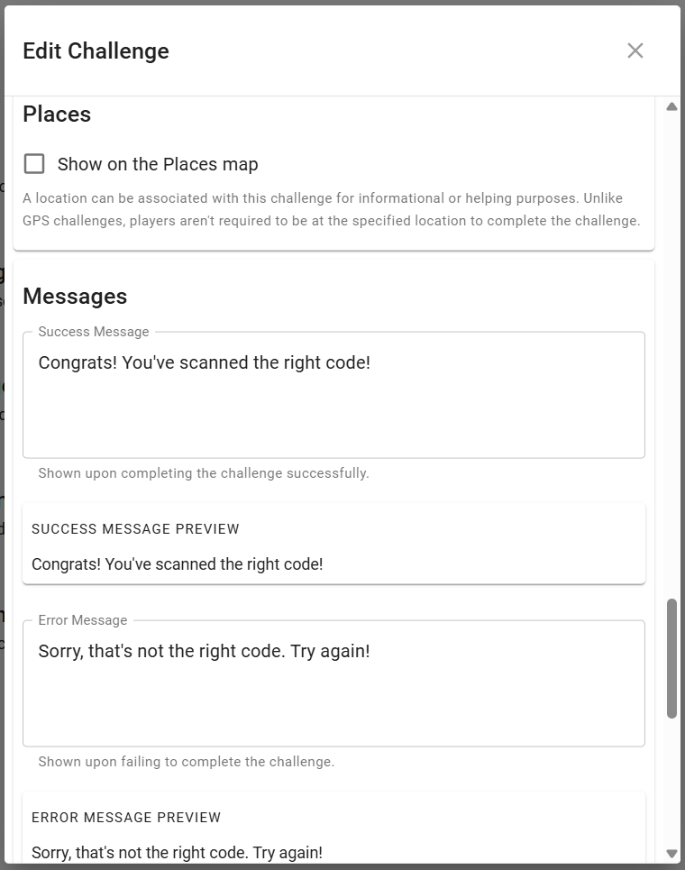 - (Optional) Success Message: By default, the message a player will see in a popup upon completing the challenge is set to "Congrats! You've scanned the right code!" Feel free to change this message if you would like.